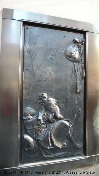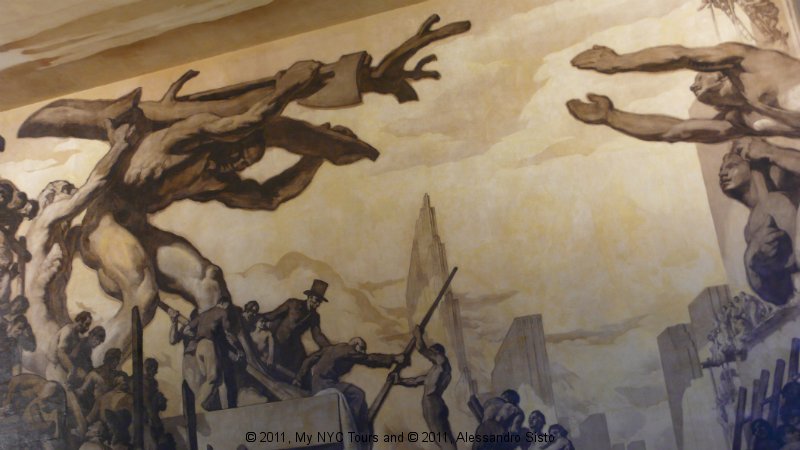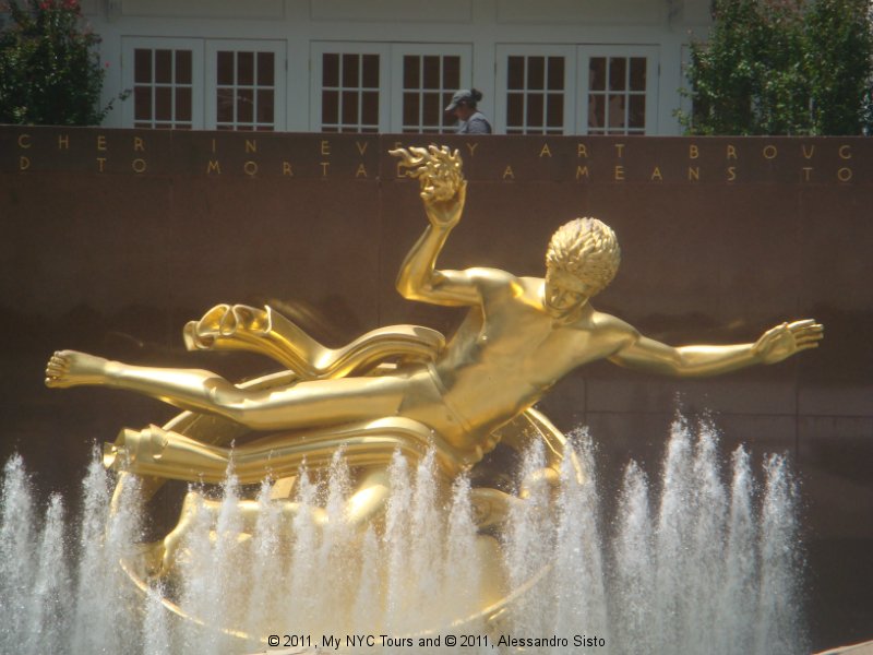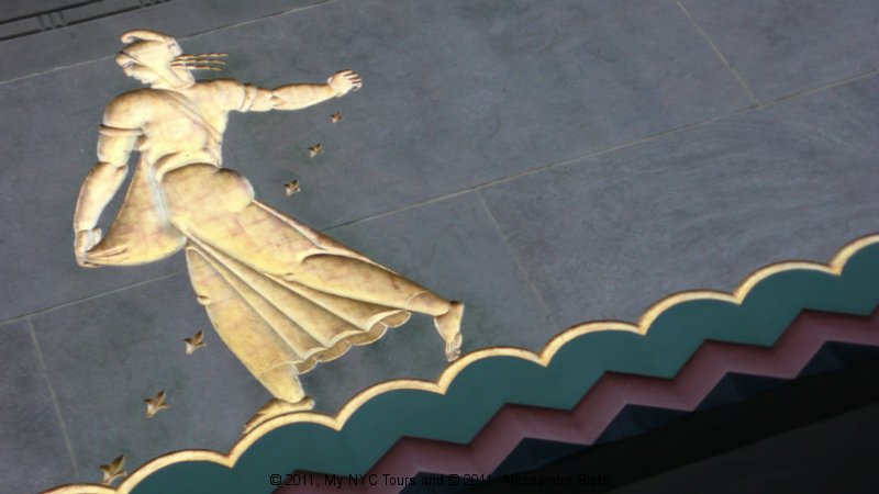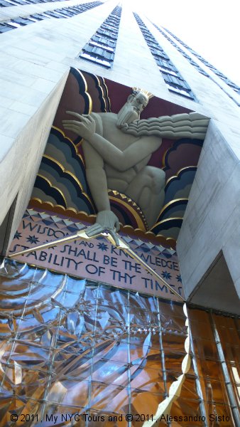 The Center is also filled with large public works of art, including scuplture, murals, and painted reliefs, all focused on the theme “New Frontiers.” These include Paul Manship’s, Prometheus Bringing Fire to Mankind, 1934, a gilded bronze scuplture that seems to float above the famous skating rink; and reliefs by Lee Lawrie expressing the idea that wisdom and knowledge of the universe will bring security and fulfillment. The interior the GE Building has murals by José Maria Sert of man’s search for immortality through his conquest of space and time covering the walls of the main lobby.