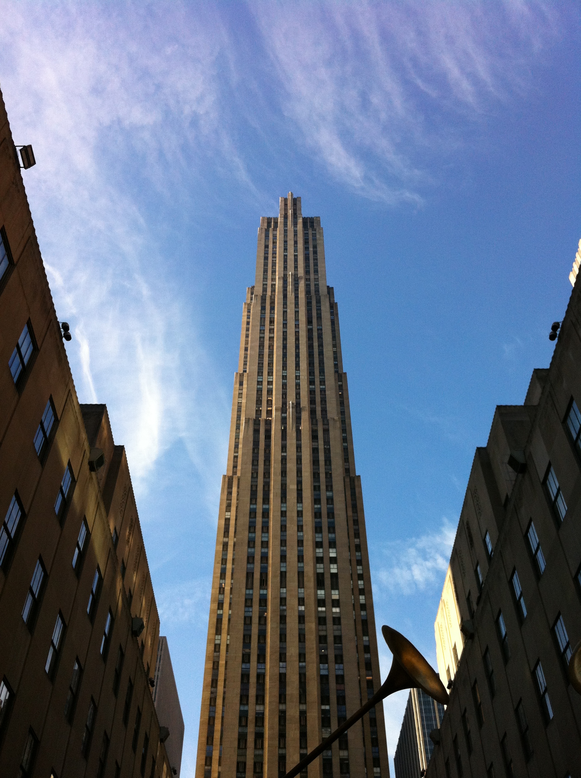 Rockefeller Center consists of 21 buildings, the first date from between 1931 and 1940, others were added to the complex in successive building phases. The GE Building (30 Rockefeller Plaza) is at the center of the original complex. Its attenuated form with long veritcal lines are characteristic of the Art Deco period, and was in part due to the architect and Rockefeller’s wishes that as much natural light as possible entered the building. The long vertical sections are accentuated by stacks of narrow windows, one over the other. It is approached from 5th Avenue walking past the “Channel Gardens” between the Maison Française and the British Empire Buildings, dedicated in memory of Dr. Hosack, the owner of the Elgin Botanical Gardens. A private road, Rockfeller Plaza runs north-south and connects another group of buildings. All of the spaces were carefully designed so as not to overwhelm the visitor. The buildings are steel core faced in Indiana limestone, and setbacks are used to create open spaces and to subtly articulate the buildings. Once again verticality is emphasized. The lower buildings had roof gardens to provide private areas for rest and relaxation within the office complex, as well as giving those on higher floors a pleasant view.